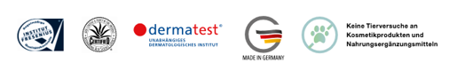 Nutze qualitativ hochwertige Produkte, getestet von Institut Fresenius, Dermatest, Tierversuchsfrei, ohne Plastikpartikel